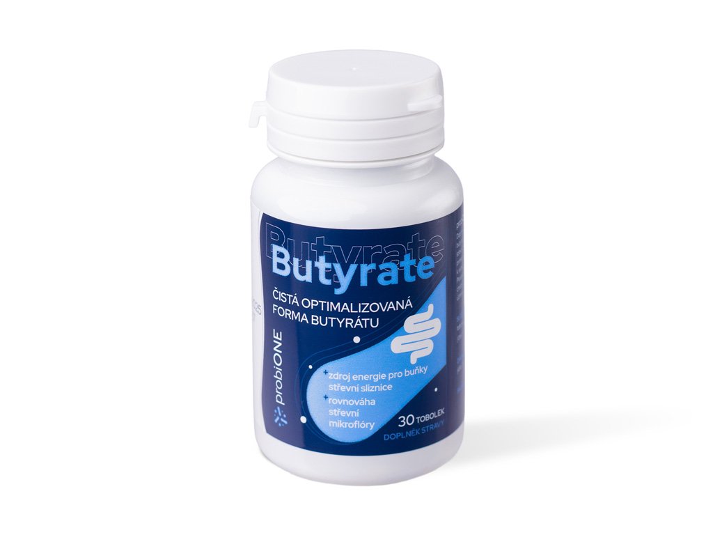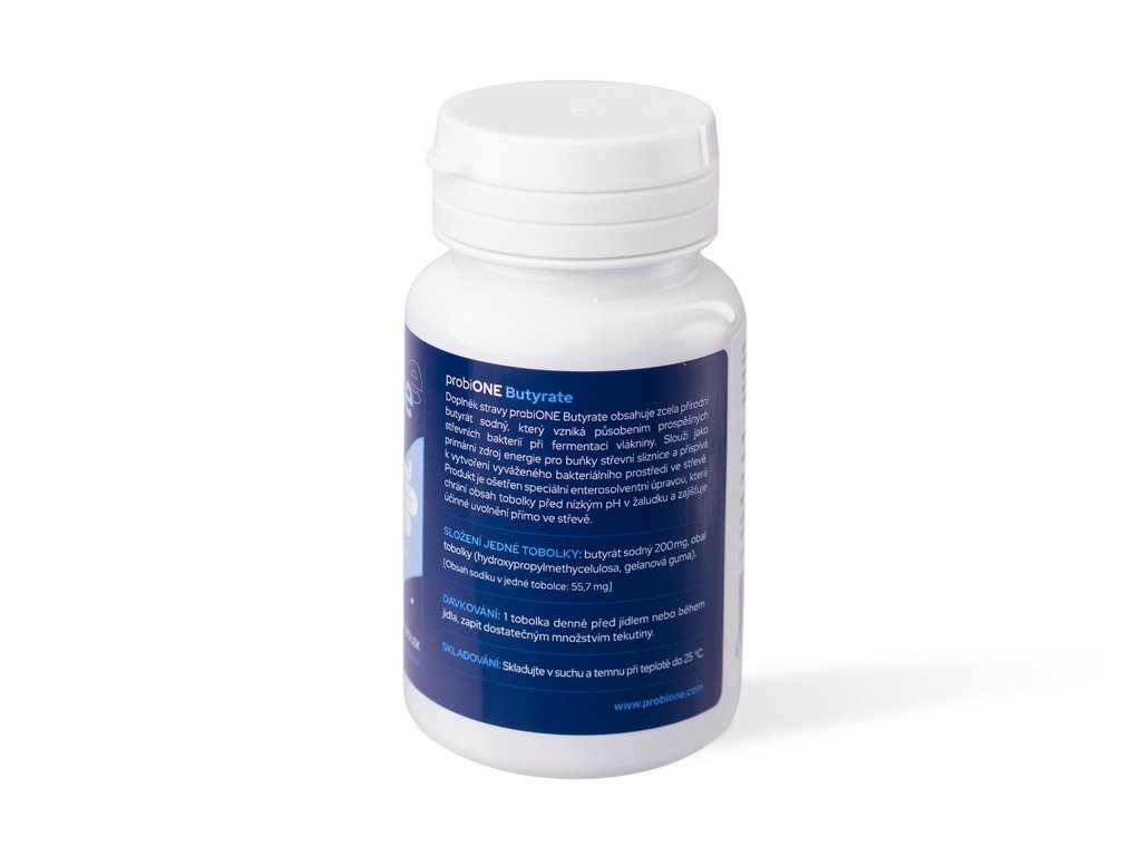 Doplněk stravy probiONE BUTYRATE obsahuje zcela přírodní butyrát sodný, který vzniká působením prospěšných bakterií při fermentaci vlákniny. Slouží jako primární zdroj pro buňky střevní sliznice a přispívá k vytvoření vyváženého bakteriálního prostředí ve střevě. Produkt je ošetřen speciální enterosolventní úpravou, která chrání obsah tobolky před nízkým pH v žaludku a zajišťuje účinné uvolnění přímo ve střevě.